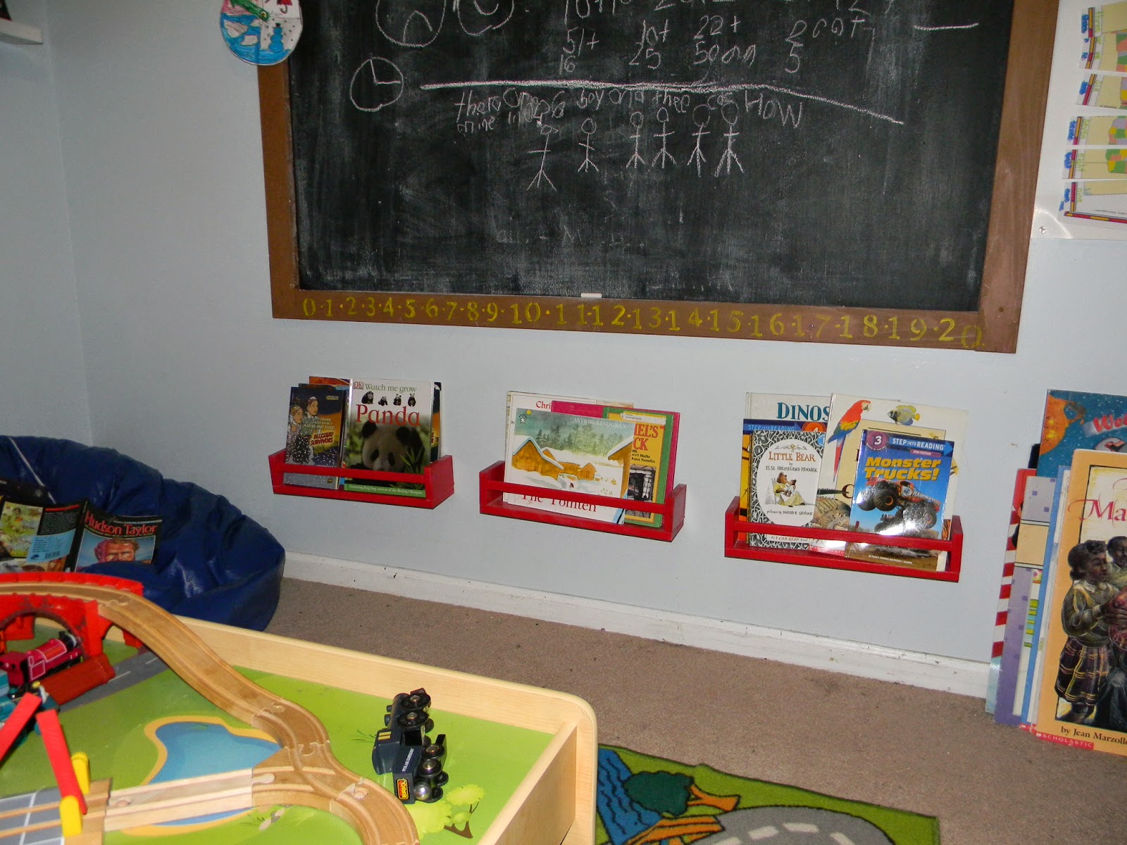 again, I love IKEA. and these shelves are fantastic. but, you don't need these particular ones. the idea here, for me, is to give each kid a shelf of books I want them to read or attempt to read. I rotate these out fairly frequently and whenever they want me to read a random book, I tell them to grab one off their red shelf....and I don't get stuck reading Clifford the Big Red Dog. again. and they really like the idea that it is their own bookshelf.